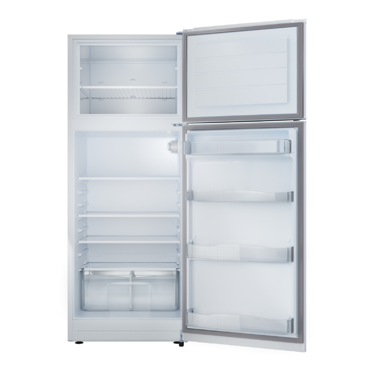 Heladera con freezer cíclica. Eficiencia D. Color blanco. Gas R600a. Capacidad bruta 364 litros. Capacidad neta 363 litros. Deshielo manual. Estantes de vidrio en refrigerador y alambrón en freezer. Anaqueles en contrapuerta. Cajón para frutas y verduras. Control de temperatura interior. Luz LED.
